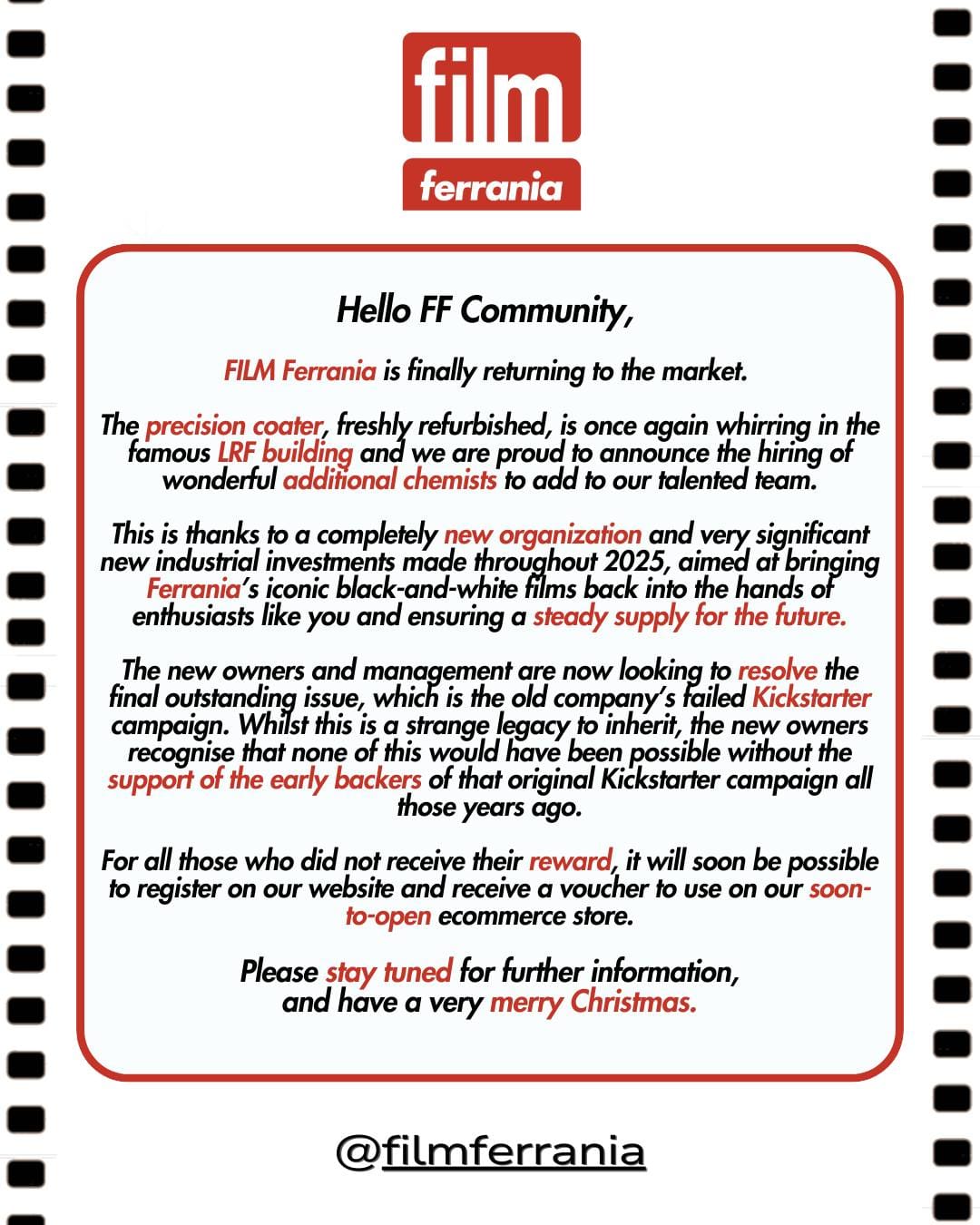 Po latach losowych dropów różnego rodzaju filmów dostajemy w końcu informacje od samego źródła: włoski producent filmów Film Ferrania deklaruje intensywny powrót do produkcji materiałów światłoczułych.